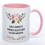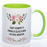 Blümchen-Tasse mit Spruch "Statt Konfetti einfach gleich den Locher werfen." - Lustige Kaffeetasse spülmaschinenfest