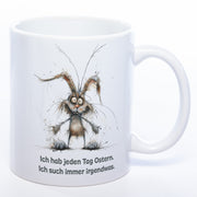 Eine Tasse, die nicht nur mit ihrem lustigen Hasenmotiv verzaubert, sondern auch mit ihrem lustigen Spruch: Ich hab jeden Tag Ostern. Ich such immer irgendwas.