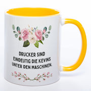 Blümchen-Tasse mit Spruch "Drucker sind eindeutig die Kevins unter den Maschinen." - Lustige Kaffeetasse spülmaschinenfest