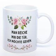 Blümchen-Tasse mit Spruch "Man reiche mir die Tür, ich möchte gehen." - Lustige Kaffeetasse spülmaschinenfest