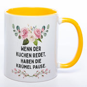 Blümchen-Tasse mit Spruch "Wenn der Kuchen redet, haben die Krümel Pause" - Lustige Kaffeetasse spülmaschinenfest