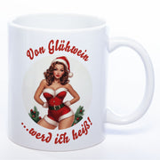 Mit dieser Tasse bringst Du Schwung in die Weihnachtszeit! Die hochwertige Keramiktasse besticht durch ihr originelles Retro-Design: Eine stilvolle PinUp-Illustration zeigt eine sexy Dame / einen sexy Boy im weihnachtlichen Outfit, begleitet von dem frechen Spruch: „Von Glühwein? Werd ich heiß!“. Perfekt für alle Glühwein-Fans, die das Besondere lieben!
