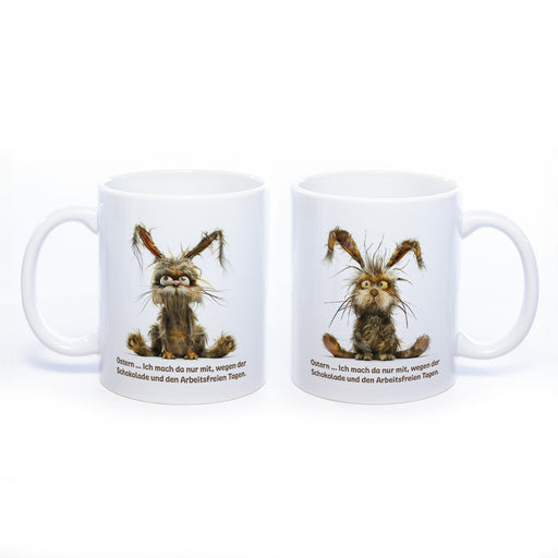 Eine Tasse, die Dich nicht nur mit ihrem lustigen Hasenmotiv zum Lachen bringt, sondern auch mit ihrem lustigen Spruch: Ostern... Ich mach da nur ...